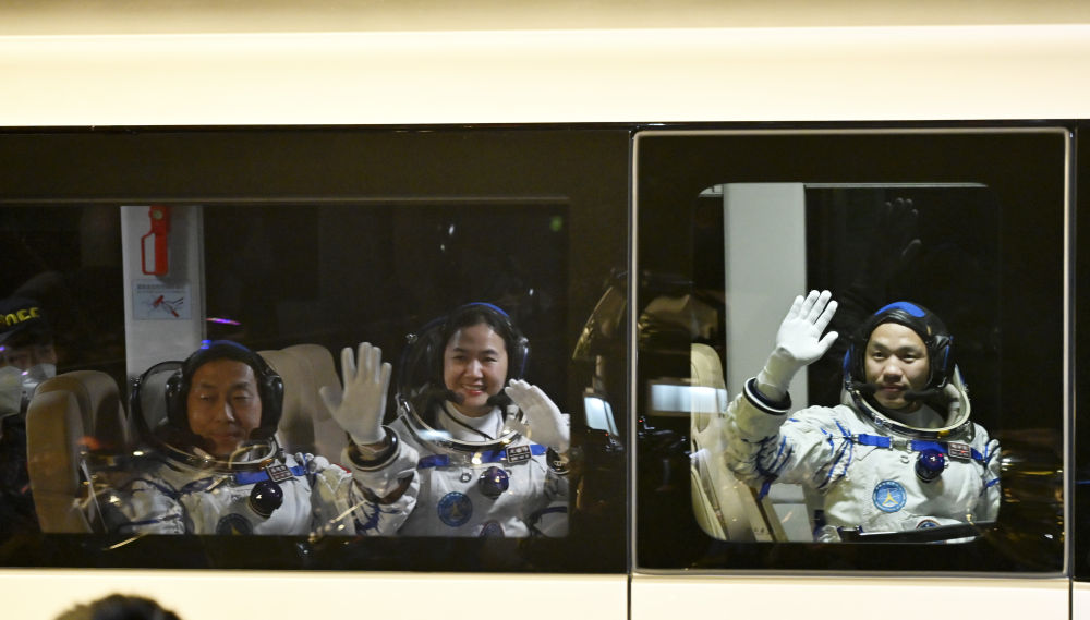 这是航天员蔡旭哲(左)、宋令东(右)、王浩泽在出征仪式上。