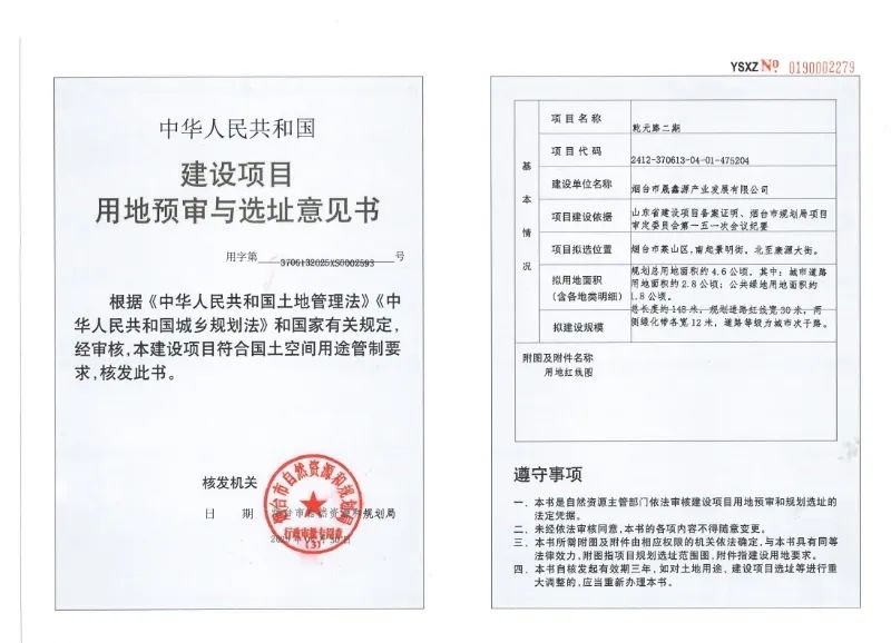 乾元路二期建设项目在2025年4月30日取得《建设项目用地预审与选址意见书(建字第3706132025XS0002593号)》。根据《行政许可法》《城乡规划法》等法律法规要求,现将已批准的用地预审与选址意见书相关内容向社会公布。