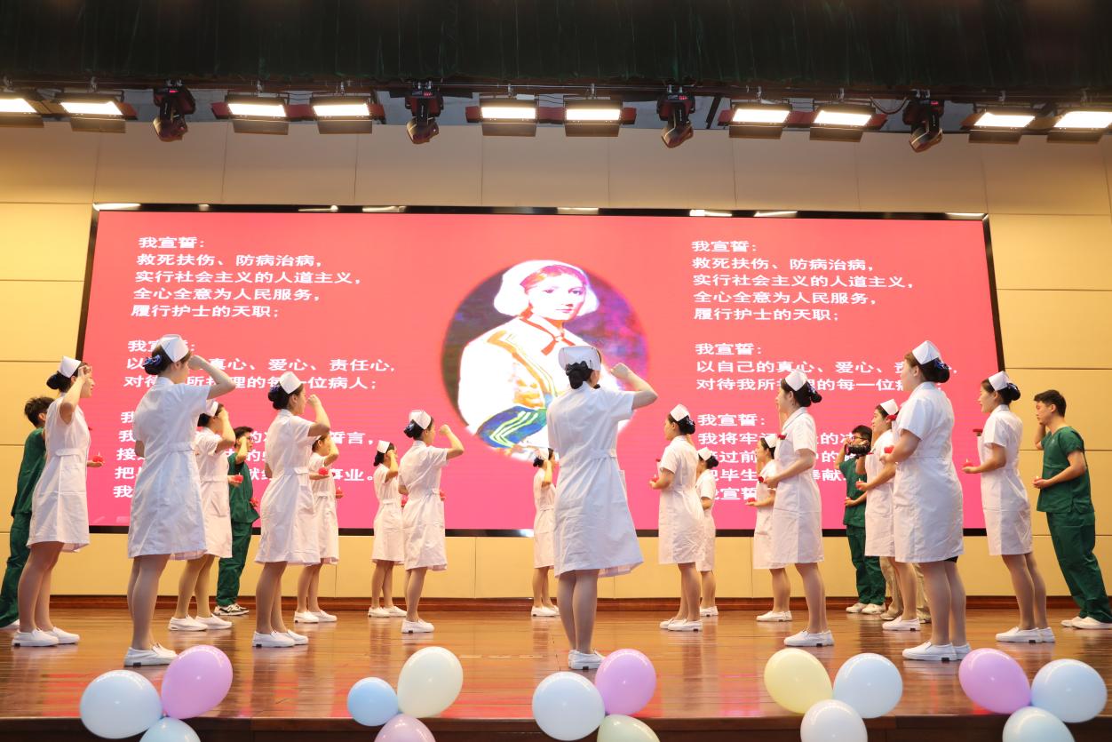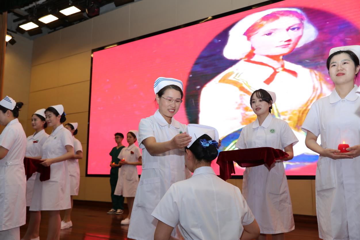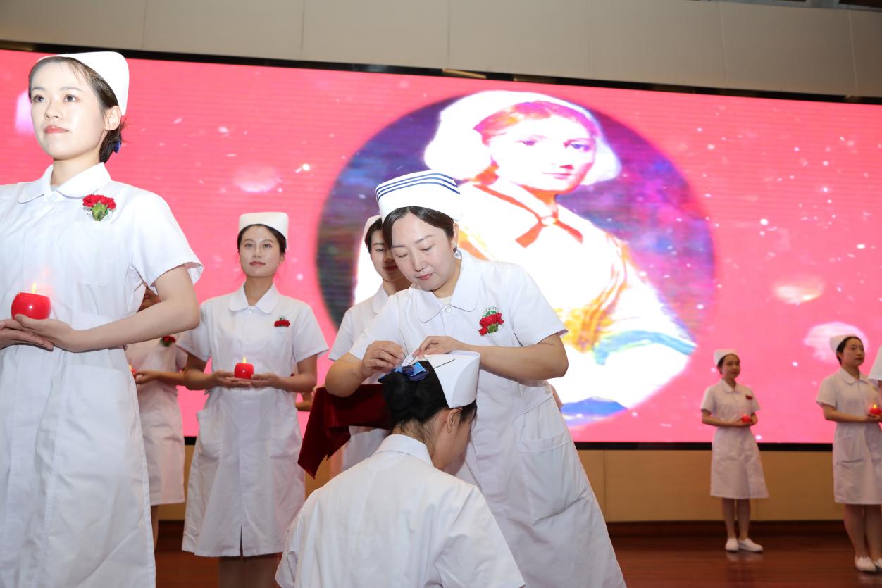 新护士授帽仪式将整场活动推向高潮。伴随着悠扬的音乐,即将走上工作岗位的准护士们身着洁白的护士服,手捧燃烧的蜡烛,满怀期待走向护理前辈。护理部主任王猛、党支部书记迟俊涛依次为准护士们戴上圣洁的燕尾帽,将护理事业的初心与使命一并交付。在保健科主管护师初妮的带领下,新护士们庄严宣誓,铿锵誓言彰显初心如磐,镌刻出对生命的敬畏和对护理事业的无限热爱。