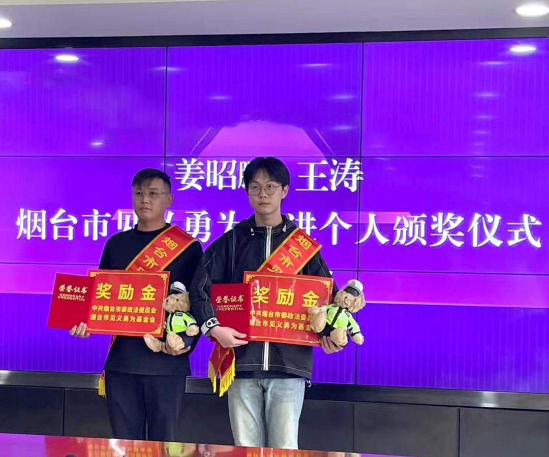 昨日,烟台市委政法委、市见义勇为基金会授予山东城市服务职业学院学生姜昭鹏(右)和网约车司机王涛“烟台市见义勇为先进个人”荣誉称号。