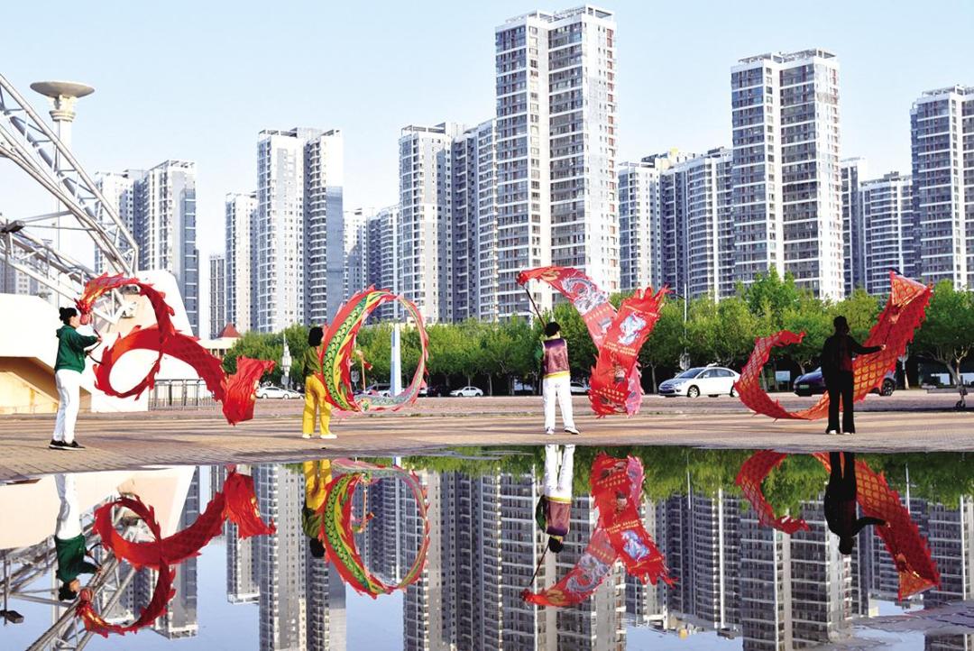 清晨,体育公园内舞龙爱好者腾挪翻转,彩龙翻飞,活力满满。