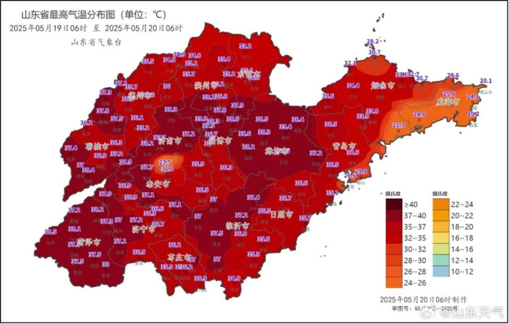 19日白天,鲁西北、鲁中和鲁南的部分地区最高气温37~39℃,局部达40℃,沿海地区24~30℃,其他地区32~36℃。预计20—21日鲁西北、鲁中和鲁南地区仍将出现35℃以上的高温天气。其中,20日菏泽、济南北部、淄博北部、潍坊和鲁西北地区最高气温37~39℃,局部可达40~42℃,南部沿海地区25~28℃,其他地区33~36℃;21日聊城、鲁中和鲁南的部分地区最高气温仍可达35~37℃。