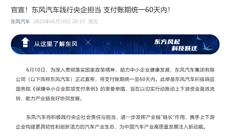 6月10日晚间至6月11日凌晨,广汽集团、中国一汽、东风汽车、赛力斯集团、吉利汽车、长安汽车、比亚迪汽车等车企先后对外发声表态,对供应商的支付账期不超60天。