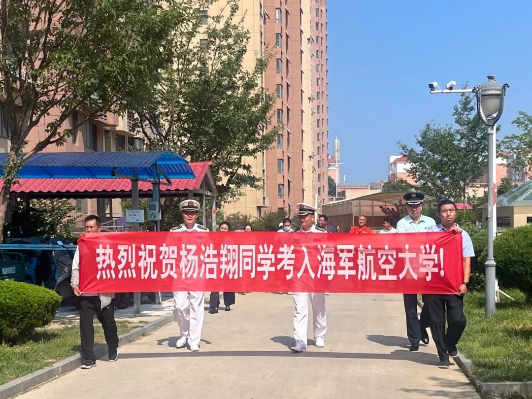 日前,烟台高新区马山街道海岸社区内锣鼓喧天、喜气洋洋,一场特殊的“送喜报”仪式在此举行——辖区高考学子杨浩翔以优异成绩被海军航空大学录取,海军航空大学、莱山区武装部、高新区马山街道相关负责同志携手社区工作人员,带着烫金录取通知书专程登门祝贺,社区锣鼓队现场助兴,烟台容大物业管理有限公司精心准备的鲜花与条幅更添喜庆,共同为这个家庭送上最热烈的祝福。