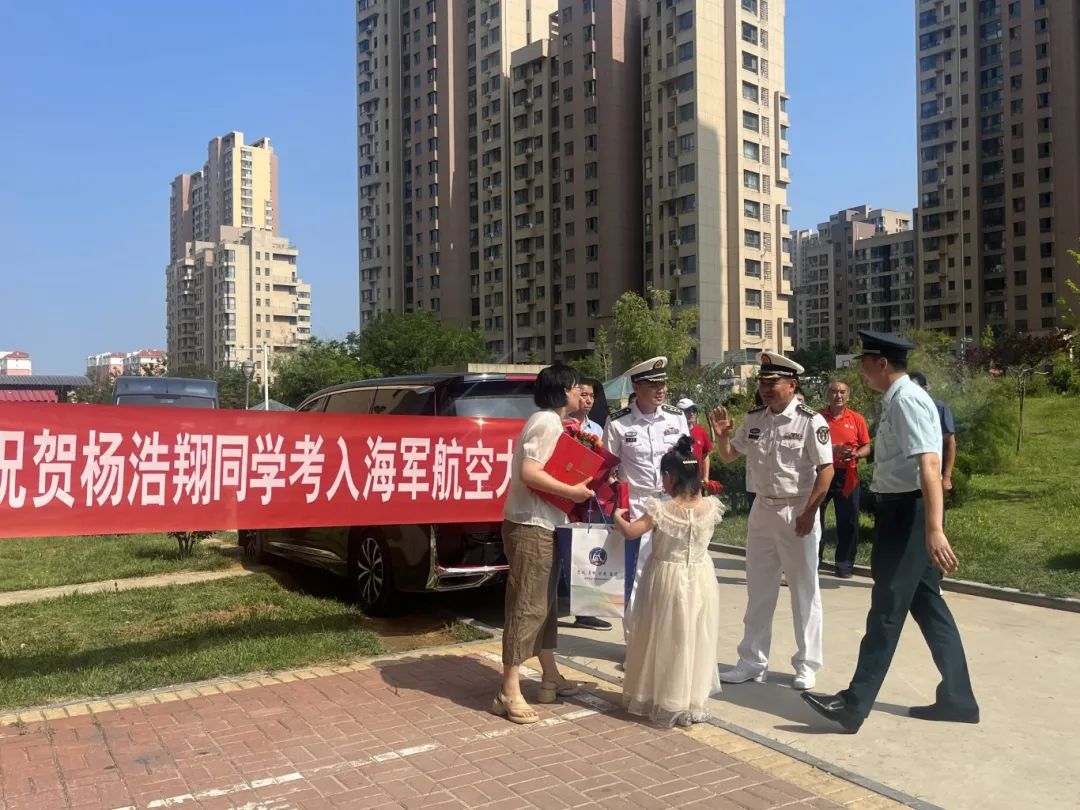 走进杨浩翔家,温馨的氛围中透着浓浓的激动。海军航空大学校领导亲手将录取通知书交到杨浩翔的母亲手中,对他表示祝贺的同时,也寄予了殷切期望:“这份录取通知书承载着学子十余载的寒窗苦读,更肩负着国家航空事业发展的殷切期盼。进入大学后,要继续秉持勤勉笃学的态度,牢记家乡的培育与社会的期许,努力成长为国家和社会所需的栋梁之材。” 社区工作人员将鲜红的条幅郑重地交给杨浩翔的家人,表示:“杨浩翔同学的成功不仅是他个人和家庭的骄傲,也是我们整个辖区的荣耀。我们希望通过这样的方式,让更多家庭感受到教育的力量,激励更多孩子努力学习。”