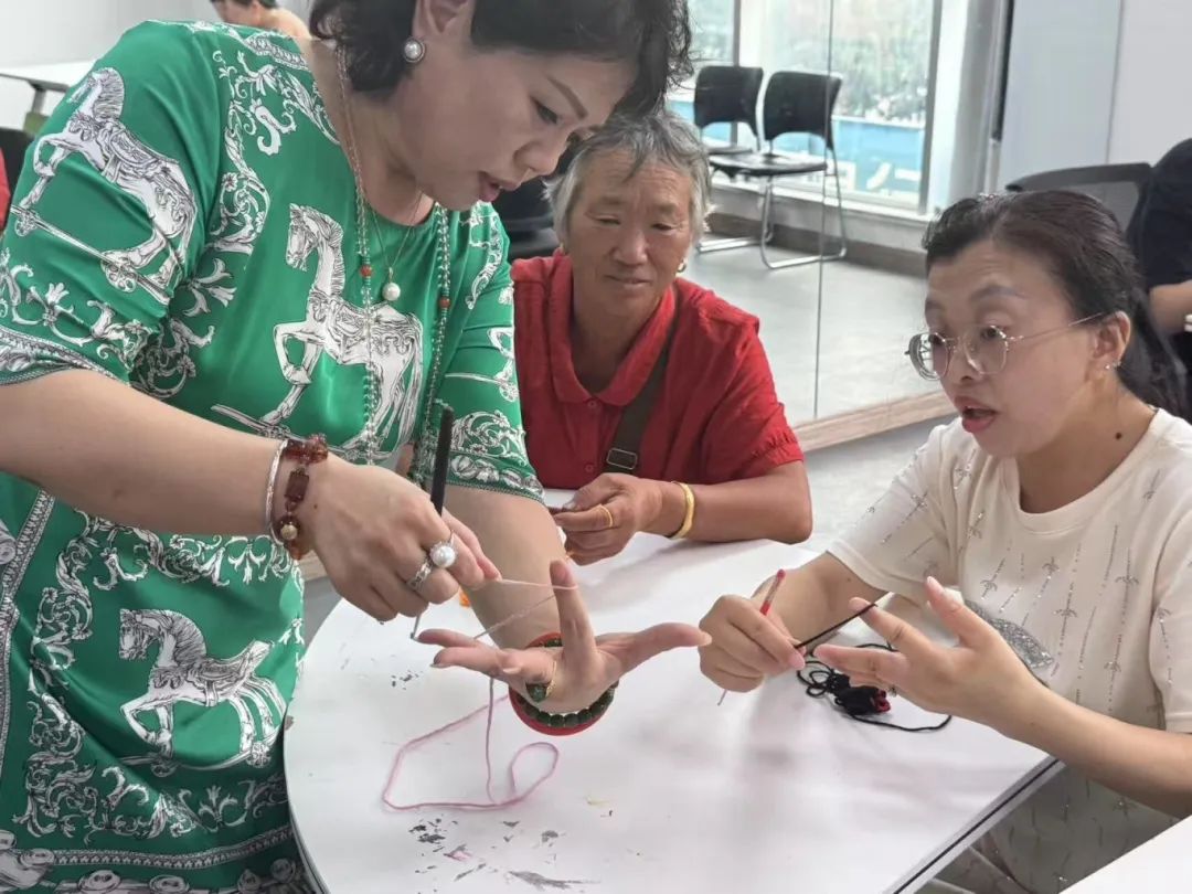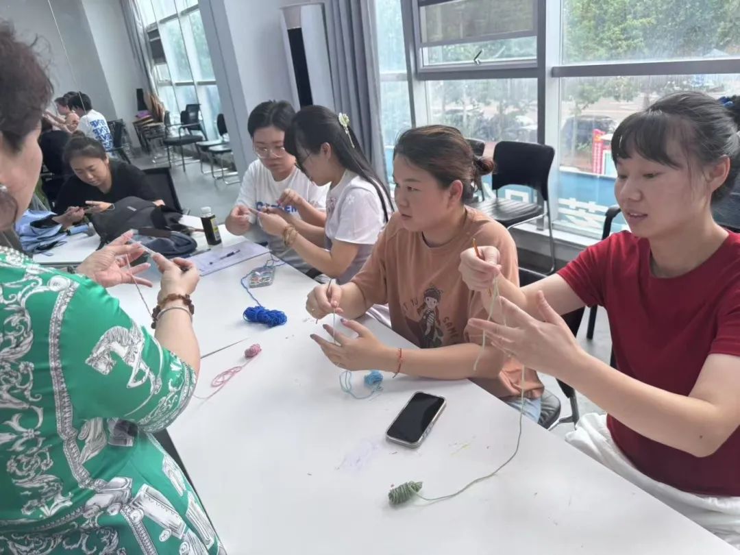 课堂上,二十余名居民围坐在一起共同学习,只见他们手中的钩针与彩线在阳光下闪着柔和的光泽。经验丰富的专业老师穿梭在学员之间,采取手把手教学的方式,从最基础的锁针、短针技法开始教学。对完全没有基础的学员,老师握着她们的手示范钩针的拿法,一遍遍纠正绕线角度;遇到进度较快的学员,老师则会指导她们“进阶”尝试花瓣、叶子等复杂图案的钩织技巧。“线要拉紧些,这样花瓣才会立体”“钩针穿过去的时候慢一点,别扎到手”,老师温和的提醒声与学员们会心的笑声交织在一起。有学员拿着刚完成的小花瓣兴奋地展示:“没想到我第一次钩就能做出像模像样的东西,太感谢老师的耐心了!”