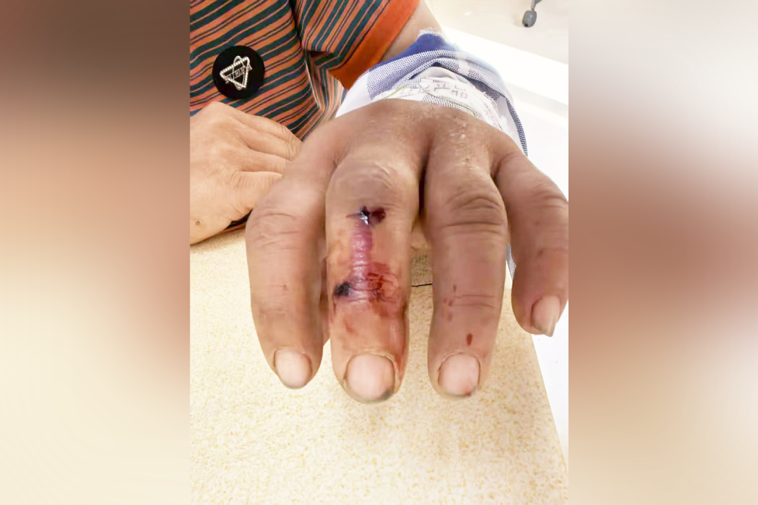 这位中年女性在果园劳作时不幸被毒蛇咬伤左手中指。