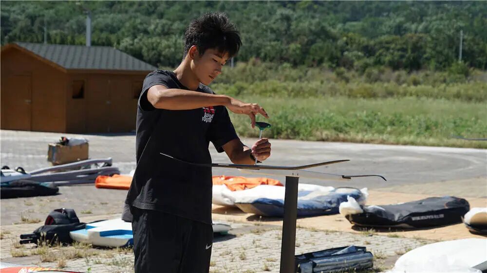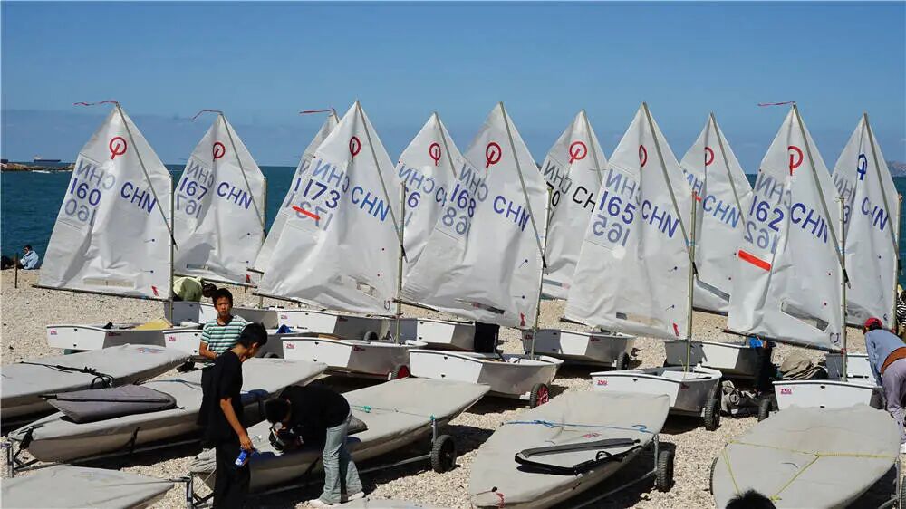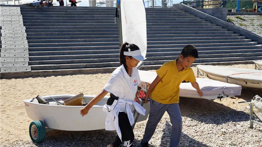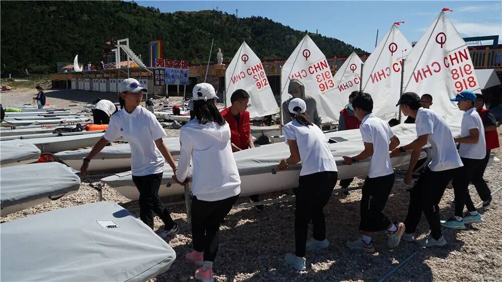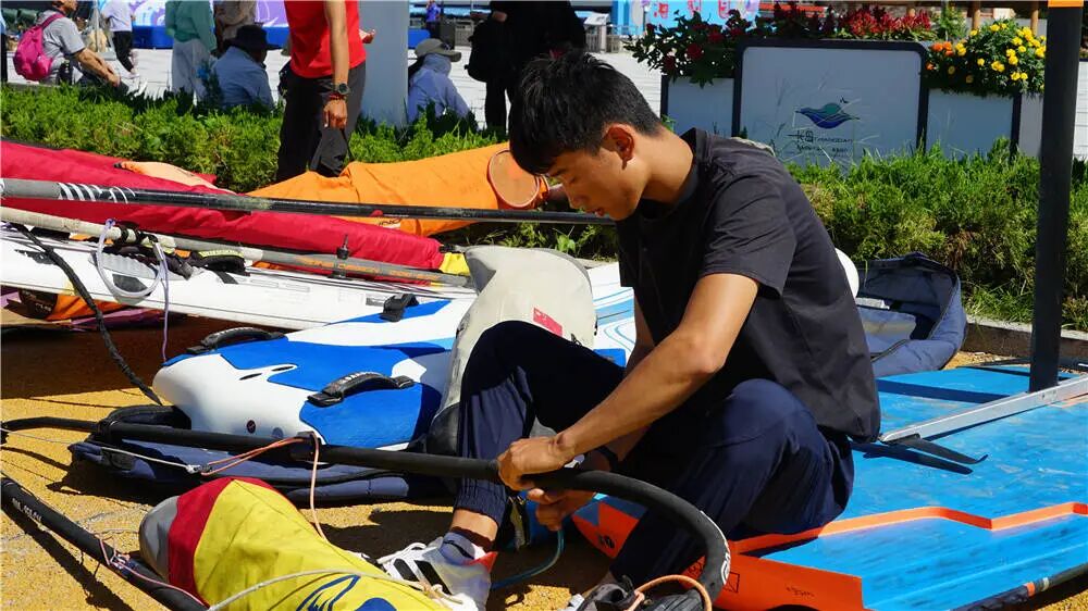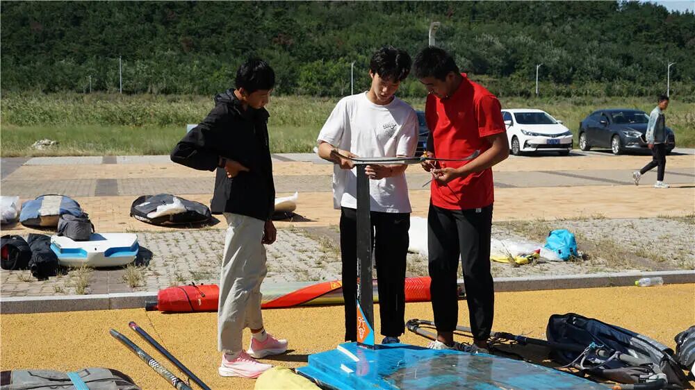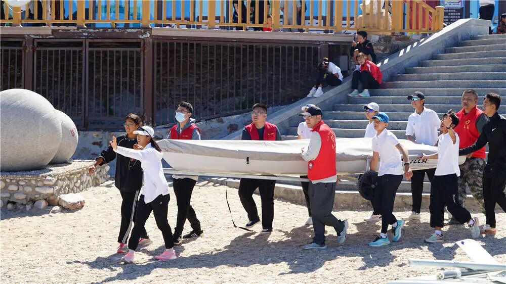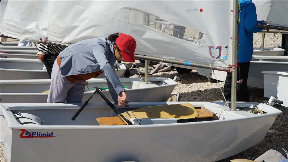 开幕式结束后,月牙湾畔立刻转入紧张而有序的赛前准备节奏。各参赛队的运动员和教练员们纷纷忙碌起来,各项准备工作正在有条不紊地进行。他们或三五成群,协作组装调试船体、安装护栏和桅杆;或细致地检查支索、滑轮的每一个细节,确保万无一失。