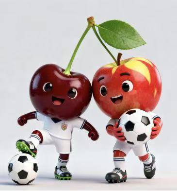 设计思路:选取烟台代表性的大樱桃和苹果,将其拟人化,赋予可爱的卡通形象与足球运动姿态。大樱桃和苹果的队服,更换成烟台队实际场上穿着的主、客场队服,二者连体展示了协作与对足球的热爱,拉近与观众的距离。