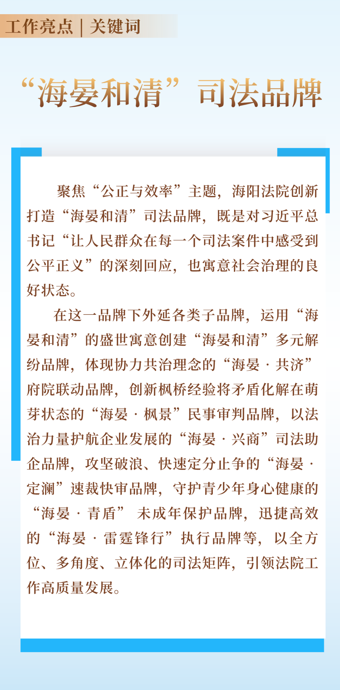 未来,海阳法院将乘“深化十大创新提升行动”长风,在守护正义的航程里、在司法为民的瀚海中破浪逐潮、创新笃行,在司法护航高质量发展的实践中,继续谱写“乘势而上逐潮行”的奋进篇章。