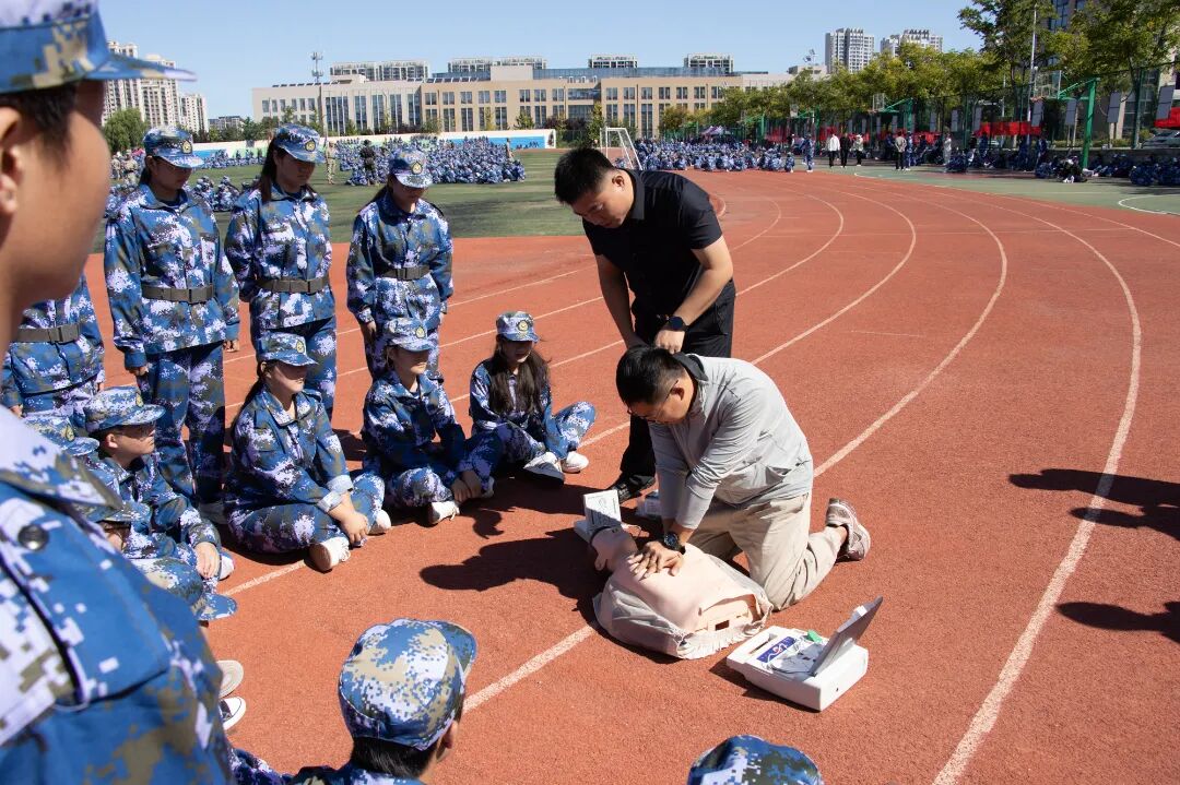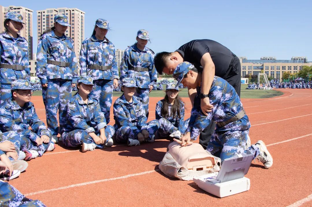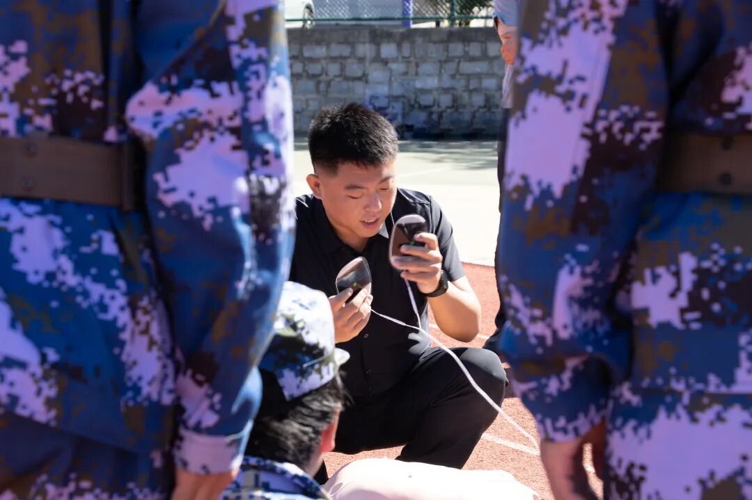 ▲高鹏在军训现场对师生进行现场教学