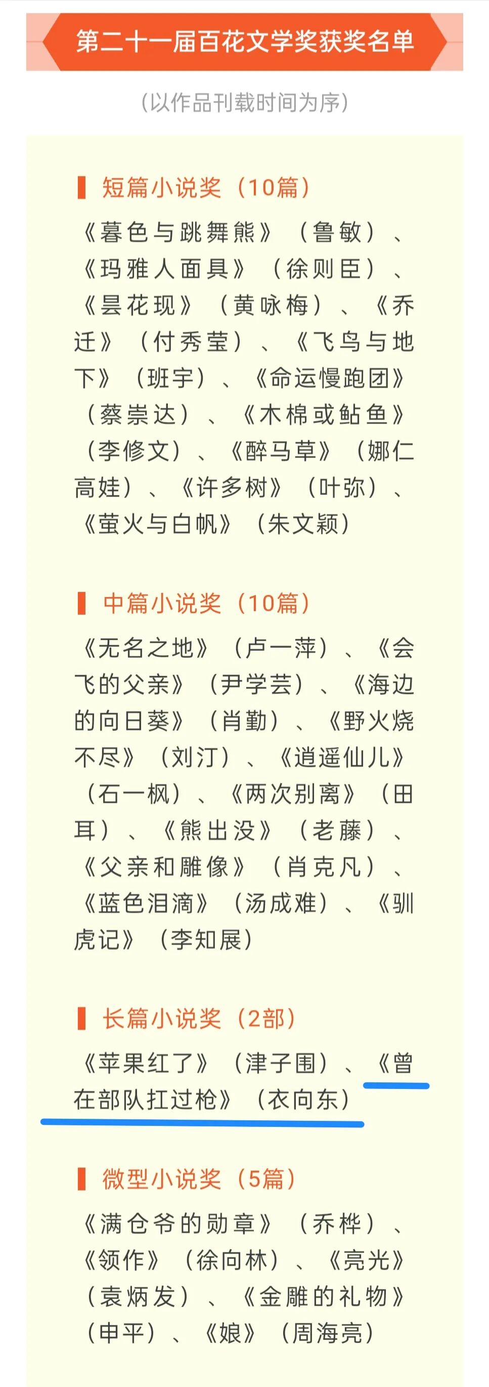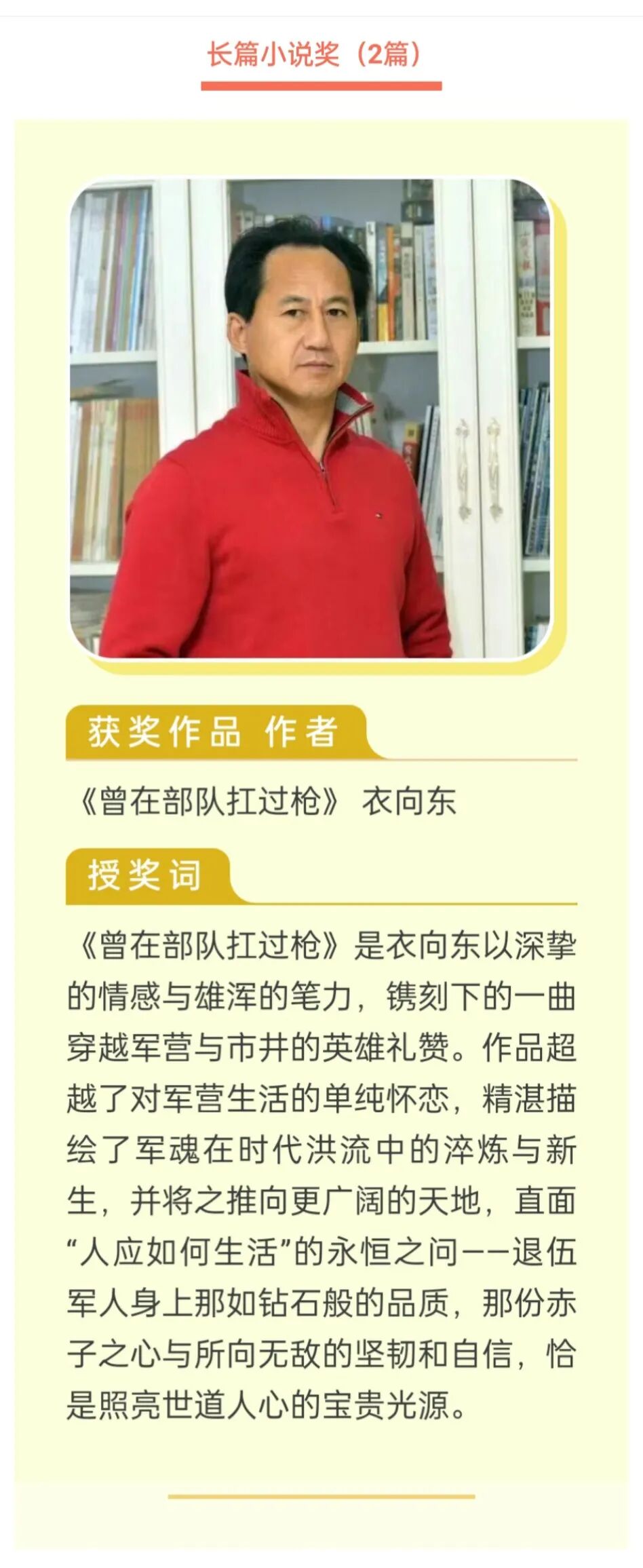 9月20日,第二十一届百花文学奖颁奖典礼在天津成功举办,众多文学界人士齐聚一堂,共襄这场文学盛宴。栖霞籍著名作家衣向东作品《曾在部队扛过枪》喜获长篇小说奖。