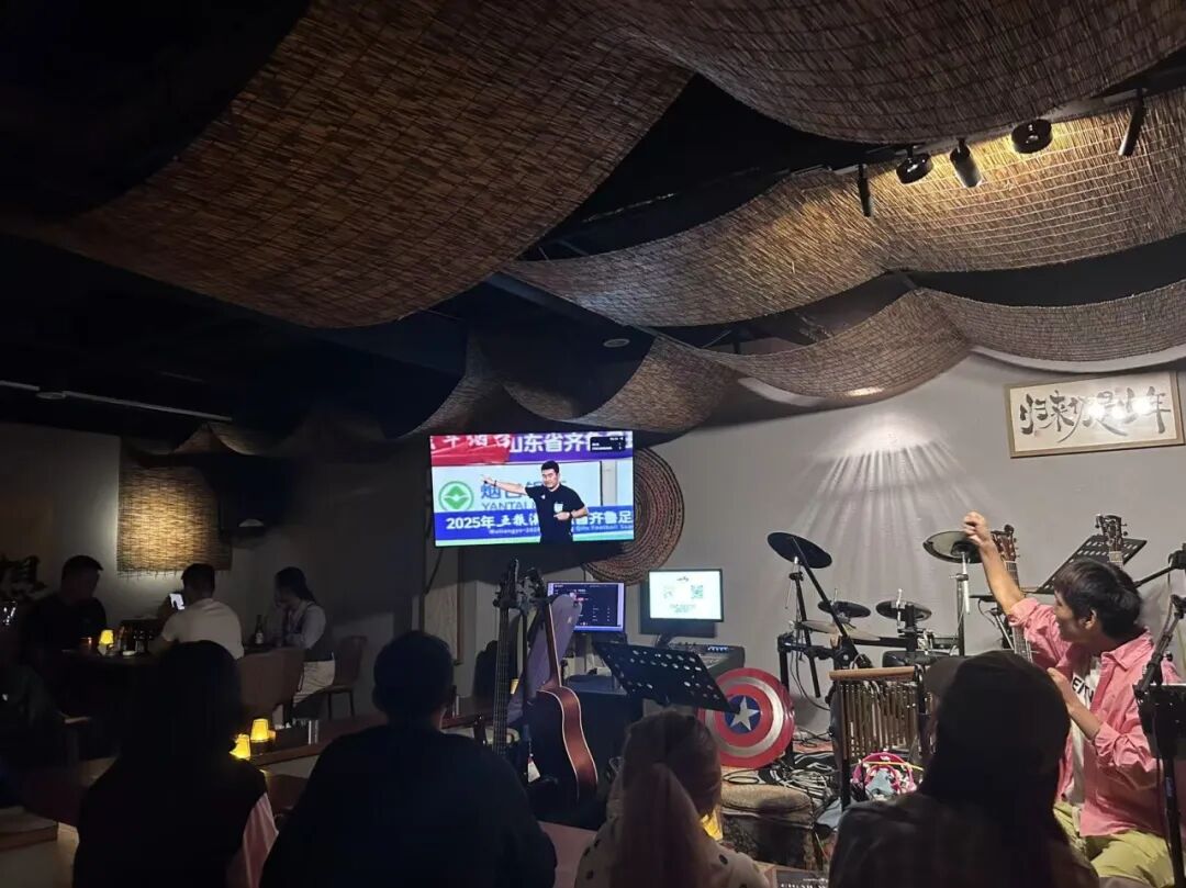 在位于桐林路的”不想Unthink”民谣酒吧中,店外早早就拉起了“鲁F球迷场外观赛点”的条幅,这一晚,店内破例不唱民谣,整夜充斥着歌手和球迷们共同的举杯与呐喊。激昂的助威与直播里的实时画面交织,形成强烈的现场感和归属感,啤酒、小食等消费也随之攀升,“第二现场”不仅补充了场外氛围,更成为莱山区“赛事+夜间“经济的新亮点。