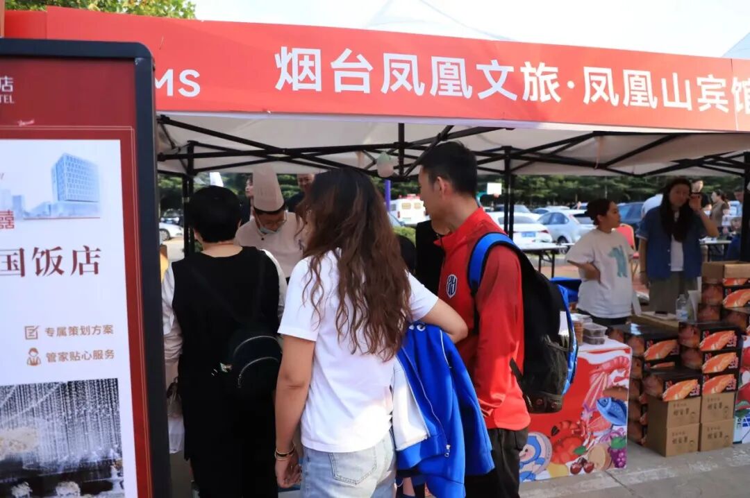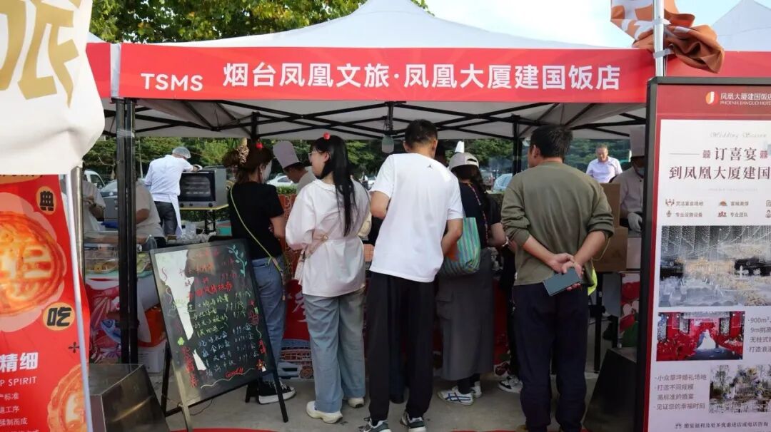 在赛场的外围,一处人流密集的集市在赛前就惹人注目,由市、区两级联合组织的“‘参’入烟台·拥‘鲍’大海 齐鲁超赛烟台站美食好品荟活动“集聚了140余个展位,其中莱山区商户占27家,烟台凤凰文旅发展集团有限公司的6个展位成为全场焦点,带来的鸡丝凉面、烧鸡等特色美食推动了消费热度持续飙升。