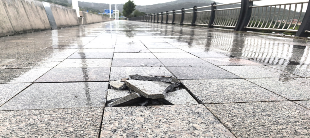9月19日下午,记者实地探访该路段。位于天籁花园小区北侧的天籁大桥东向非机动车道上,地砖破损情况较为严重。记者粗略统计,约五十米范围内,就有十余处道板砖断裂、鼓起、移位等现象。其中最严重的一处,地砖碎成数块,形成一个浅坑,周边砖体也明显松动。另有多处砖面隆起超过3厘米,雨天易积水,夜间难以辨识。
