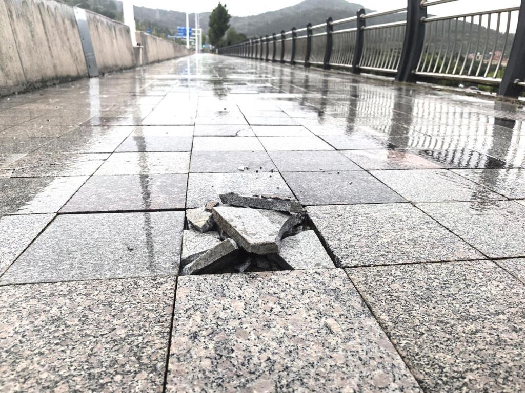 9月19日下午,记者实地探访该路段。位于天籁花园小区北侧的天籁大桥东向非机动车道上,地砖破损情况较为严重。记者粗略统计,约五十米范围内,就有十余处道板砖断裂、鼓起、移位等现象。其中最严重的一处,地砖碎成数块,形成一个浅坑,周边砖体也明显松动。另有多处砖面隆起超过3厘米,雨天易积水,夜间难以辨识。