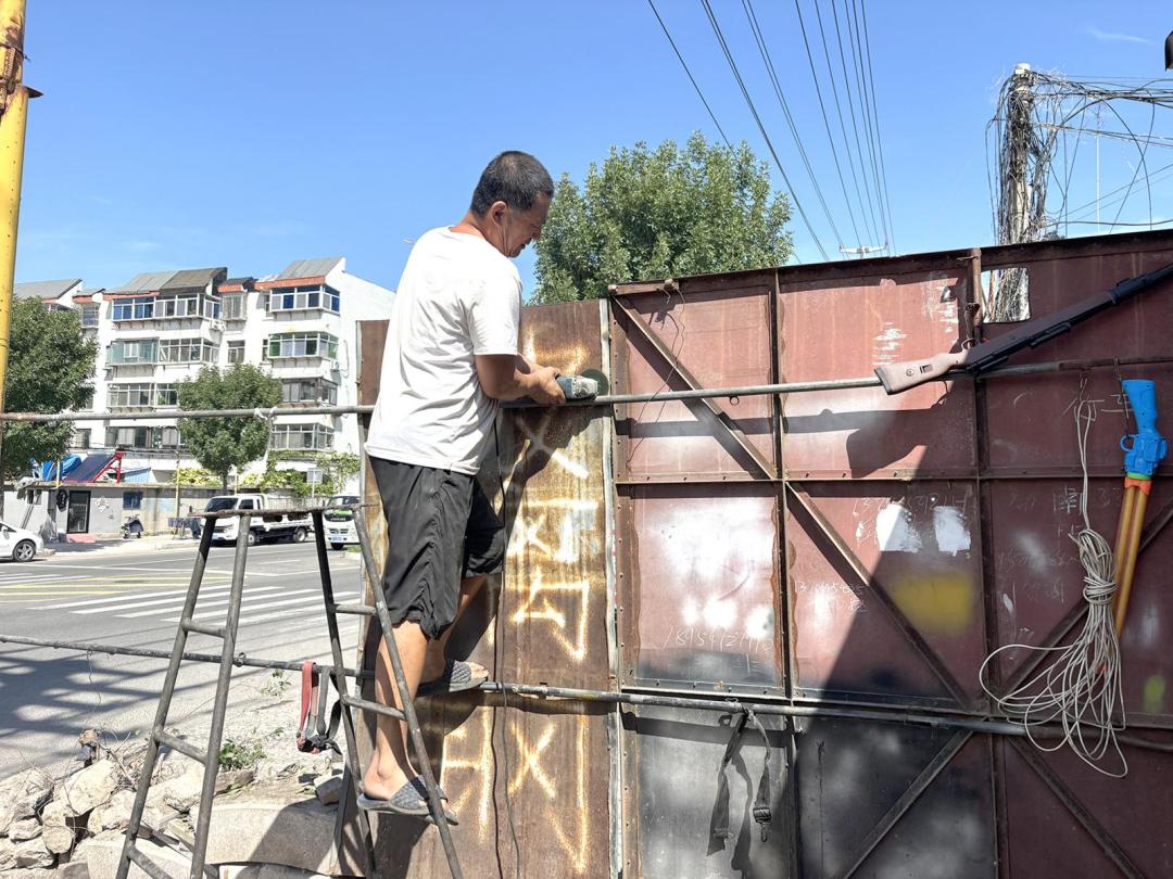 莱阳市河洛镇唐家洼村南侧有一条小路直通共建路,有市民投诉说,一家汽修店在路边搭建铁板围挡,妨碍了此处进出路口的视线。