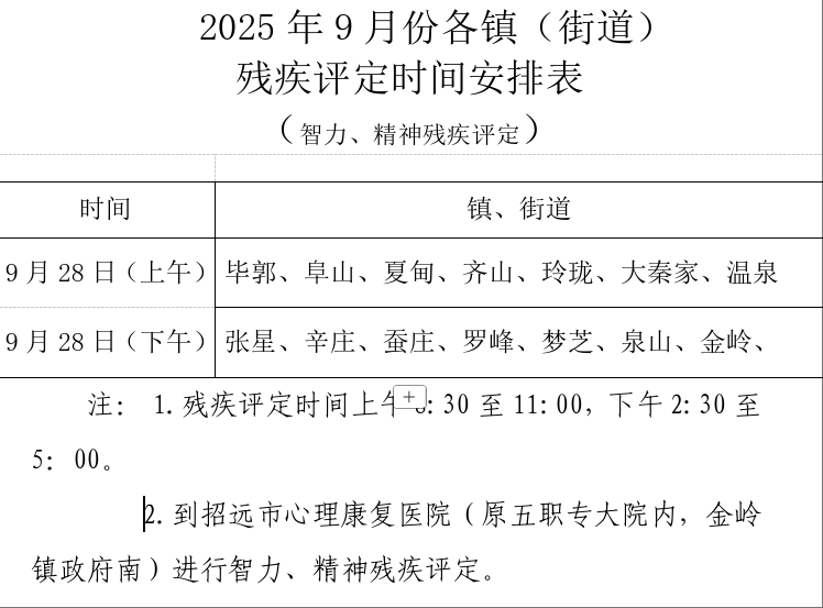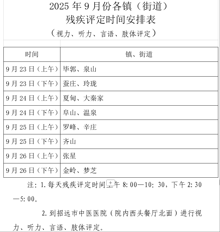 现定于2025年9月23日至26日上午8:00至10:30,下午2:30至5:00在市中医医院(院内西头餐厅北面)进行视力、听力、言语、肢体残疾评定。9月28日上午8:30至11:00,下午2:30至5:00在招远市心理康复医院(金岭镇政府驻地原五职专大院内)进行智力、精神残疾评定。