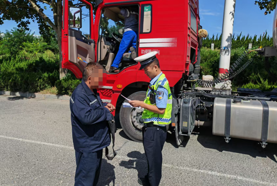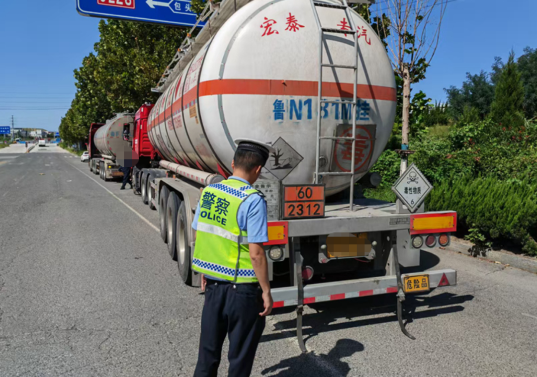 为切实加强危化品运输车辆交通安全管理,有效预防危险化学品运输车辆道路交通事故发生,烟台交警紧盯“危化品运输车”重点车辆,对发现的车辆进行逐一检查,认真对比检查车辆行驶证、驾驶员驾驶证、危化品运输证、车辆营运证、强制保险等相关证件的详细信息,对车辆行驶记录仪、刹车、轮胎、紧急切断装置以及是否按规定悬挂危化品运输标志等进行详细检查。