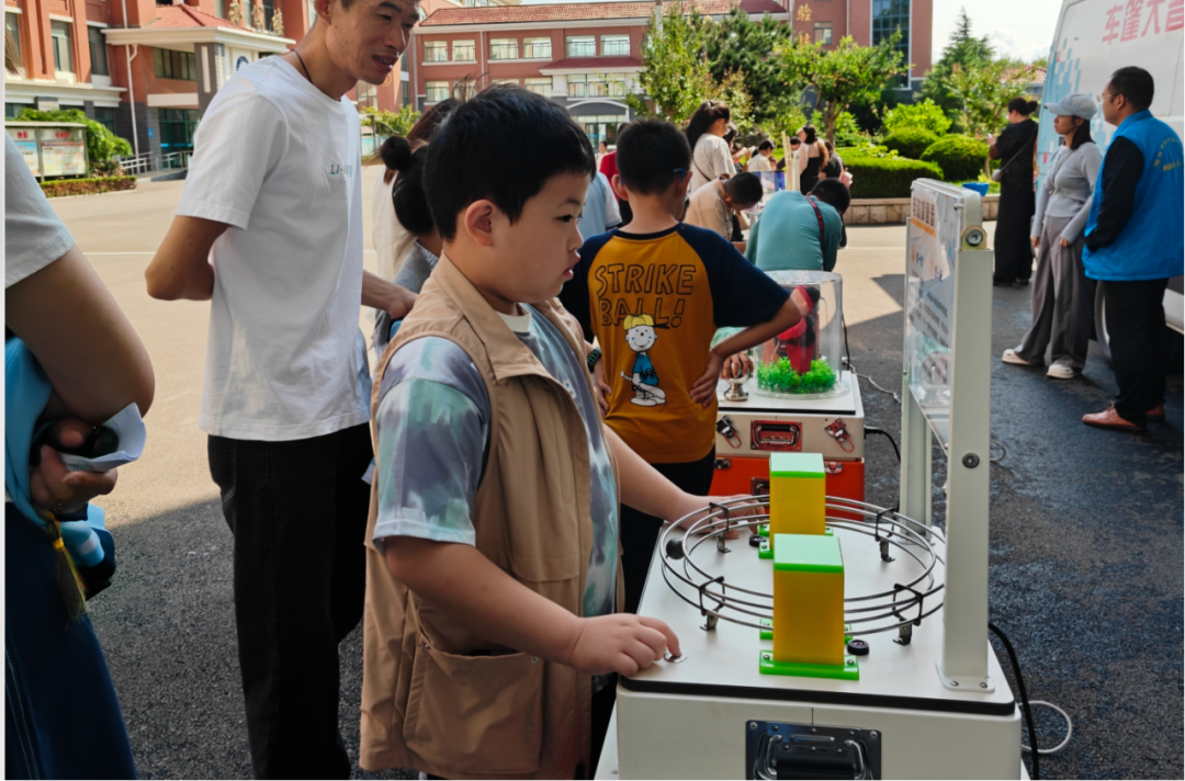 启动仪式的后半程,整个校园变成了一座科技游乐园。市科普大篷车带来二十余项互动展品,涵盖光学、力学、电磁学等多个领域。孩子们排队体验“磁悬浮转盘”“穿墙而过”“声波可见”等装置,不时互相讨论原理、尝试操作,眼中写满好奇与兴奋。