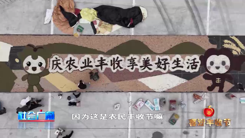 还记得那幅用玉米芯拼成的毛主席画像吗?2024年9月9日,山东滨州农民创意画家周明星在自家院子里,以金黄的玉米芯为“笔”,绘出一幅逼真传神的伟人画像。今天上午,这位“网红农民画家”带着他的新作品,亮相2025中国农民丰收节主会场。这些粮食足足有一千多斤,拼绘出一幅色彩斑斓、寓意丰收的壮丽画卷。