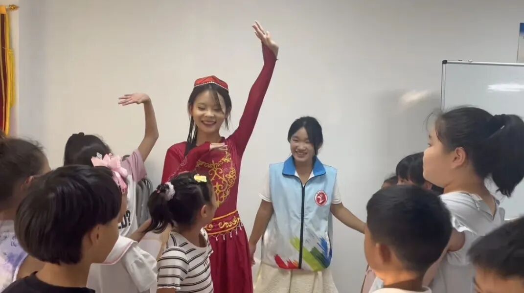 滨河社区联合烟台职业学院经济与贸易系开展民族团结主题儿童课堂,少数民族志愿者同学换上本民族传统服饰向辖区适龄儿童生动讲述少数民族的人文历史、传统习俗及特色特产,并带来当地风味特产供孩子们品尝。活动尾声,志愿者还带领小朋友们学跳少数民族舞蹈,现场载歌载舞、氛围热烈。此次课堂让孩子们在沉浸式体验中感受民族文化魅力,进一步加深了对民族团结内涵的理解,让民族团结的种子在童心深处扎根发芽。