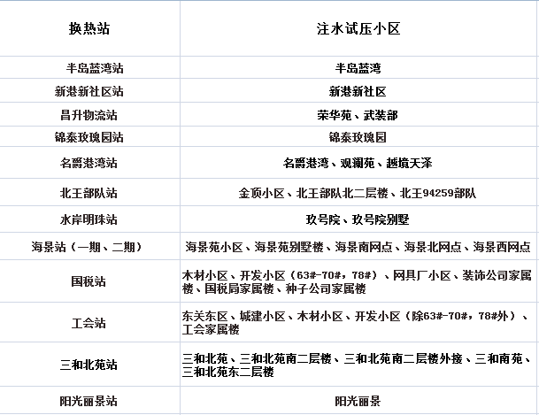 烟台市蓬莱区滨海热力有限公司将于2025年9月26日、27日、28日对16个换热站(半岛蓝湾站、新港新社区站、昌升物流站、锦泰玫瑰园站、名爵港湾站、北王部队站、水岸明珠站、海景站、国税站、工会站、三和北苑站、阳光丽景站、故里站、馨和站、杏花苑站、泰山府站)的用户暖气系统进行注水试压,打压注水后家中用热设施至供暖结束日将一直保持有水、有压。