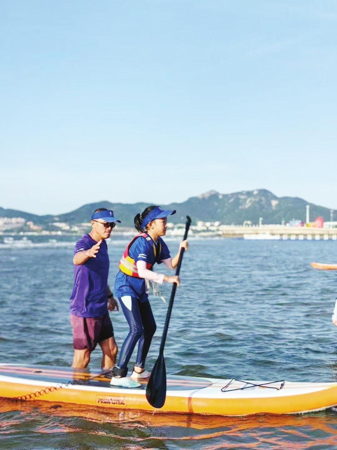 “桨板运动拥有独特魅力,对于青少年亲近自然、增强体质、磨炼意志有不可替代的作用。”教练员冯泮奇告诉记者。在专业教学环节,5名教练将孩子们分为5个小组,开展系统教学。教练员首先讲解了桨板的结构材质、适用场景和安全须知,随后演示划行技巧,包括握桨姿势、划水节奏与平衡控制等要点。孩子们认真聆听、踊跃提问,展现出浓厚的学习兴趣和积极的探索精神。