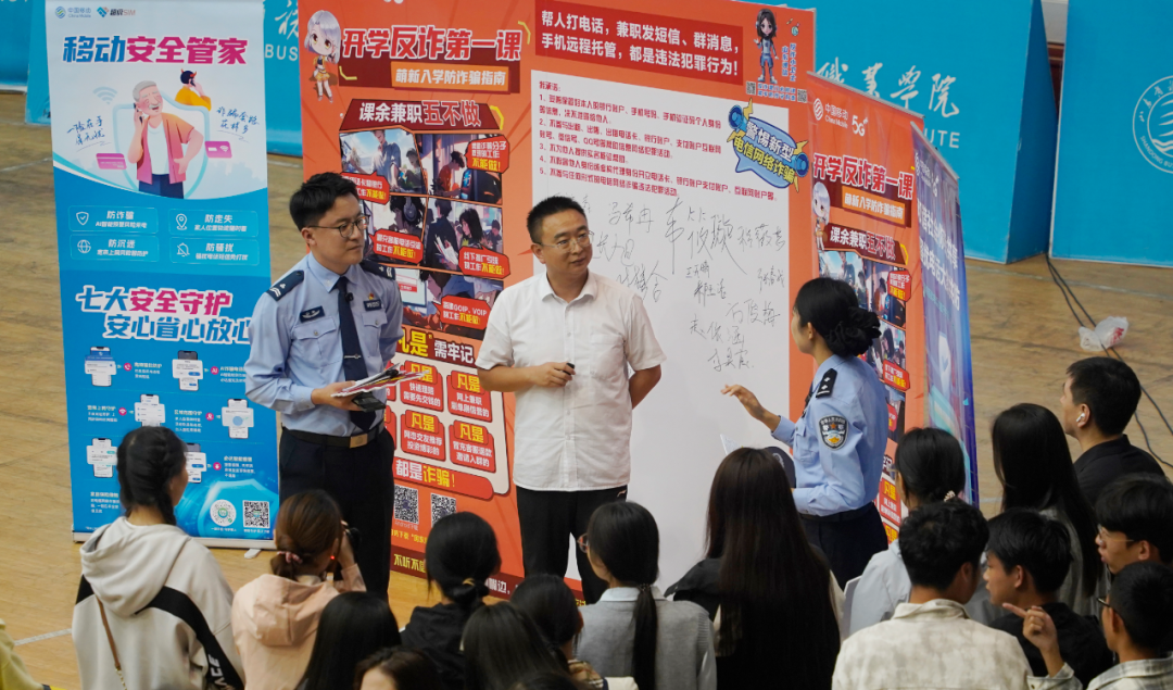 在打卡签名区,反诈民警对不做电诈工具人进行了普法,让同学们了解什么是电诈工具人,通过讲解真实案例,警示学生们莫贪小利、触碰法律红线,邀请同学们一起进行承诺宣誓,并在“警惕诈骗新手法、不做电诈工具人”签名墙上郑重落笔,承诺不出租、出借银行卡、手机卡,彰显了共同抵制电诈、守护自身财产安全的决心。