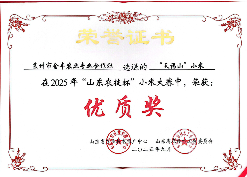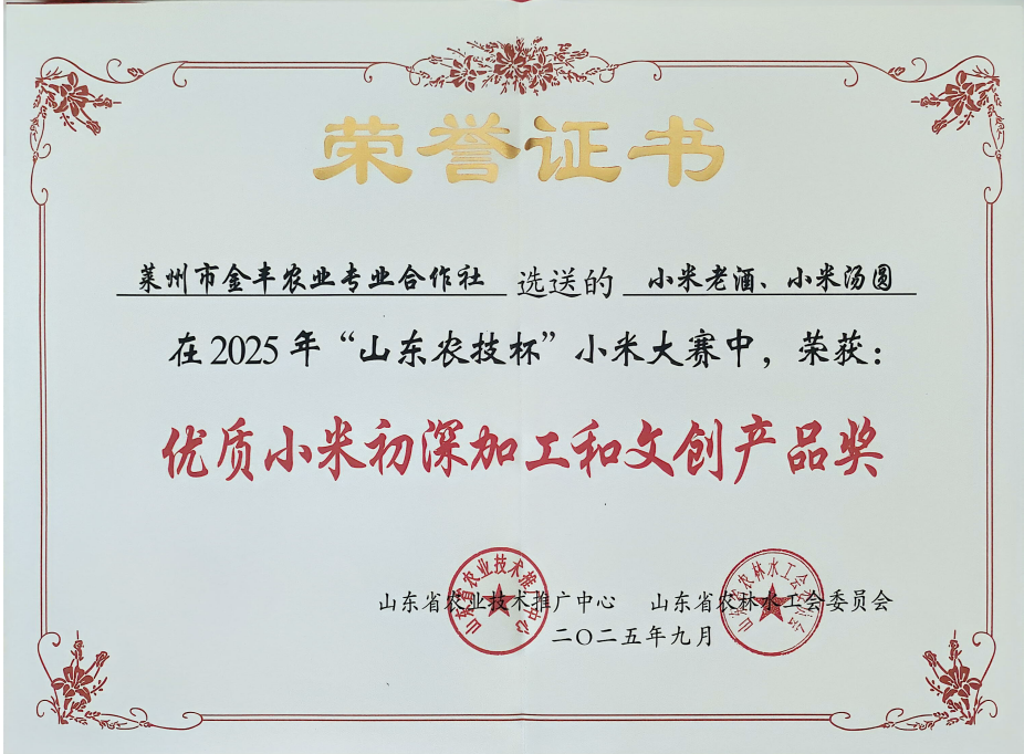 金秋九月,米香弥漫,由山东省农业技术推广中心主办的2025年谷子产业高质量发展研讨会暨“山东农技杯”小米大赛在潍坊安丘市圆满落幕。莱州市参赛队伍捷报频传、硕果盈枝。莱州市金丰农业专业合作社选送的“天福山”小米以及小米老酒、小米汤圆等产品,凭借出众的品质,在众多参赛样品中脱颖而出,分别获得优质奖和优质小米初深加工和文创产品奖。这份荣誉不仅是对其优异品质的高度认可,更是田家村深耕小米产业、锻造农业精品的生动见证,彰显莱州特色农业发展的强劲动能。