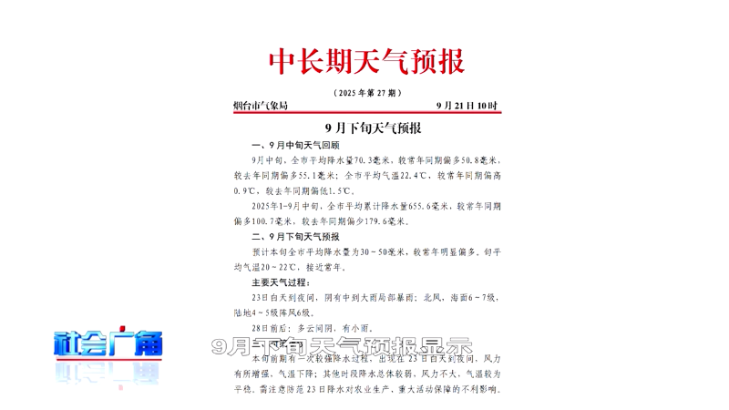 秋分节气过后昼夜温差会进一步加大,气温也会逐渐下降。根据烟台市气象台发布的9月下旬天气预报显示,9月下旬的平均气温在20到22℃之间。