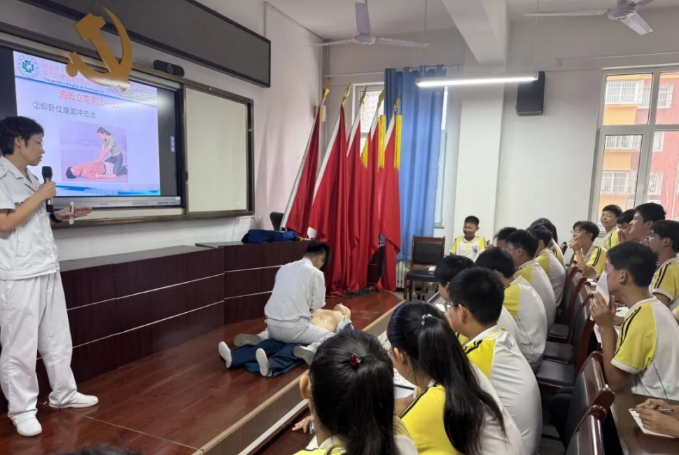 院前急救站医护人员凭借丰富的临床急救经验,结合真实案例,为师生重点讲解了“心肺复苏术”“气道异物梗阻”“中暑急救处理”及“溺水的处理”等急救知识。通过生动易懂的语言,深入剖析了各类突发状况的成因、症状与急救要点。针对中暑、溺水等常见意外,医护人员介绍了快速识别与科学处置的技巧,详细讲解了中暑的症状和不同程度中暑的应对方法,并提醒师生在高温环境下要及时补充水分和盐分,做好预防。