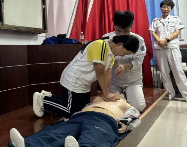 培训还深入浅出地讲解了心肺复苏的关键要点,从判断患者意识、呼吸和心跳的方法,到拨打120急救电话的注意事项,再到胸外按压、开放气道和人工呼吸的具体操作步骤,每一个环节都细致讲解,并重点强调了“黄金四分钟”的重要性,让师生深刻认识到及时、正确施救的意义。院前急救站护士通过现场演示和模拟操作,帮助师生更直观地掌握相关技能。