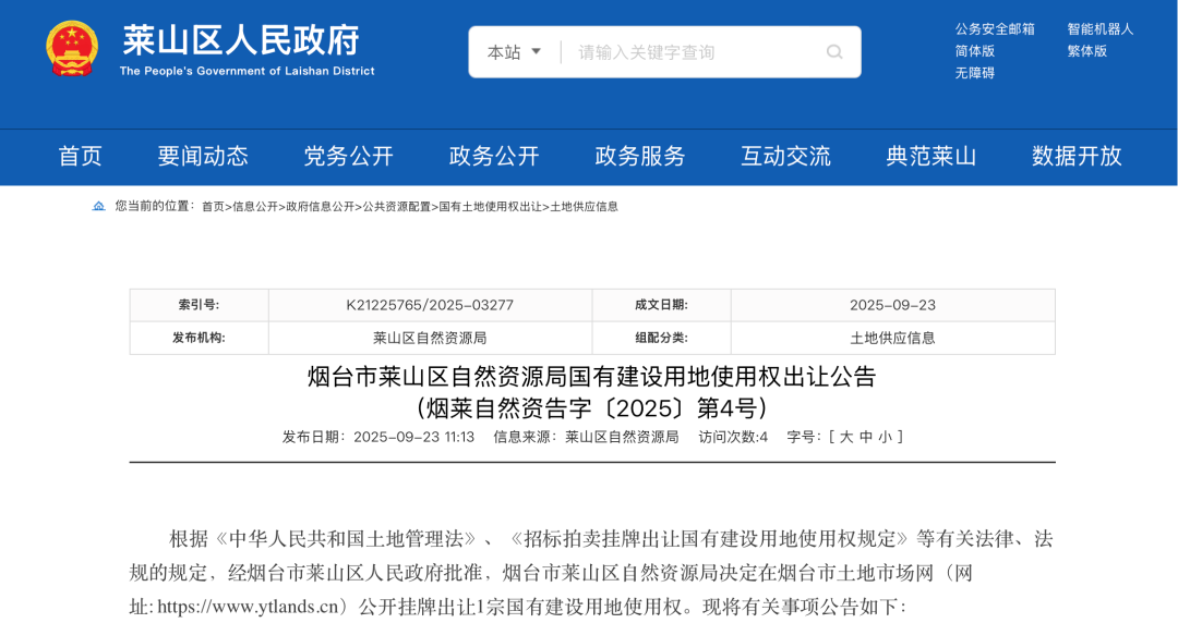 9月23日,记者从烟台市莱山区自然资源局获悉,一宗位于莱山区核心区域的住宅商服用地正式挂牌,将于近期公开拍卖出让。该地块出让起始价为人民币21400万元,备受市场关注。
