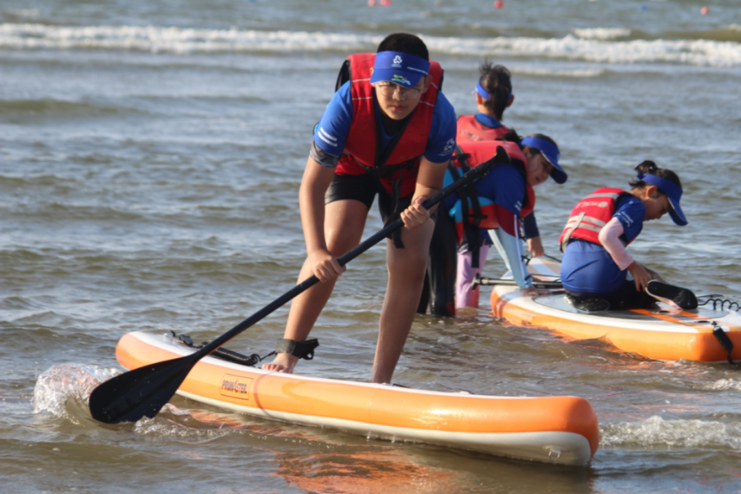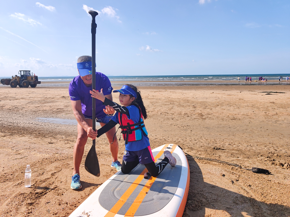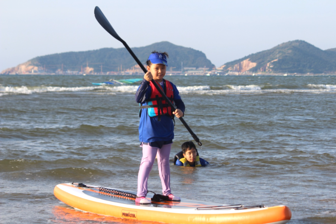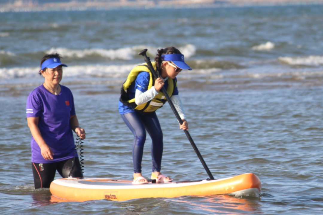 实操练习将活动推向高潮。在教练协助下,大家穿戴救生衣、手持划桨,依次踏上桨板。从跪姿划行到尝试站姿平衡,每—位参与者都勇敢尝试、不断突破,逐渐掌握技术要领,自信地站立划行,感受亲水运动的欢乐。