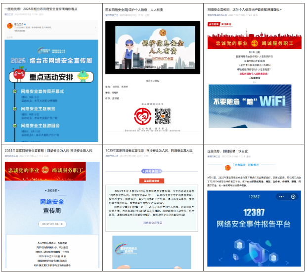 全市各级工会采取职工喜闻乐见的方式,通过各种线上渠道广泛开展网络安全主题宣传活动。充分利用工会网站、微信公众号、齐鲁工惠APP等网络平台,发布2025年国家网络安全宣传周海报和宣传手册、个人信息保护法等相关信息,同步推送主题鲜明、内容扎实的网络安全科普文章,系统地介绍网络安全基础知识、最新风险动态和防护技巧,多角度宣传普及网络安全知识,营造浓厚的网络安全知识学习氛围。