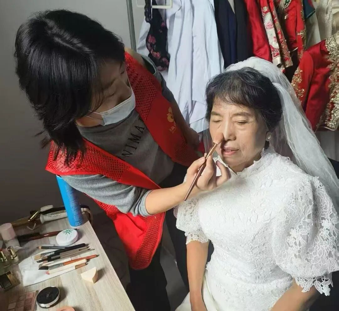 时光荏苒,岁月在皱纹里镌刻下相守的故事;步履蹒跚,却始终牵着那双温暖了半生的手。“当年结婚就领了张红本本,连张正经合影都没有”,苏阿姨坐在化妆镜前,看着工作人员为自己描上口红,边说着边红了眼眶。年轻时,他们或许因条件所限,没能拥有一套像样的婚纱照片,没能在镜头前定格下最甜蜜的模样;如今,相伴多年的两人换上西装与婚纱,在化妆师的巧手下神采奕奕,仿佛重回青春岁月。