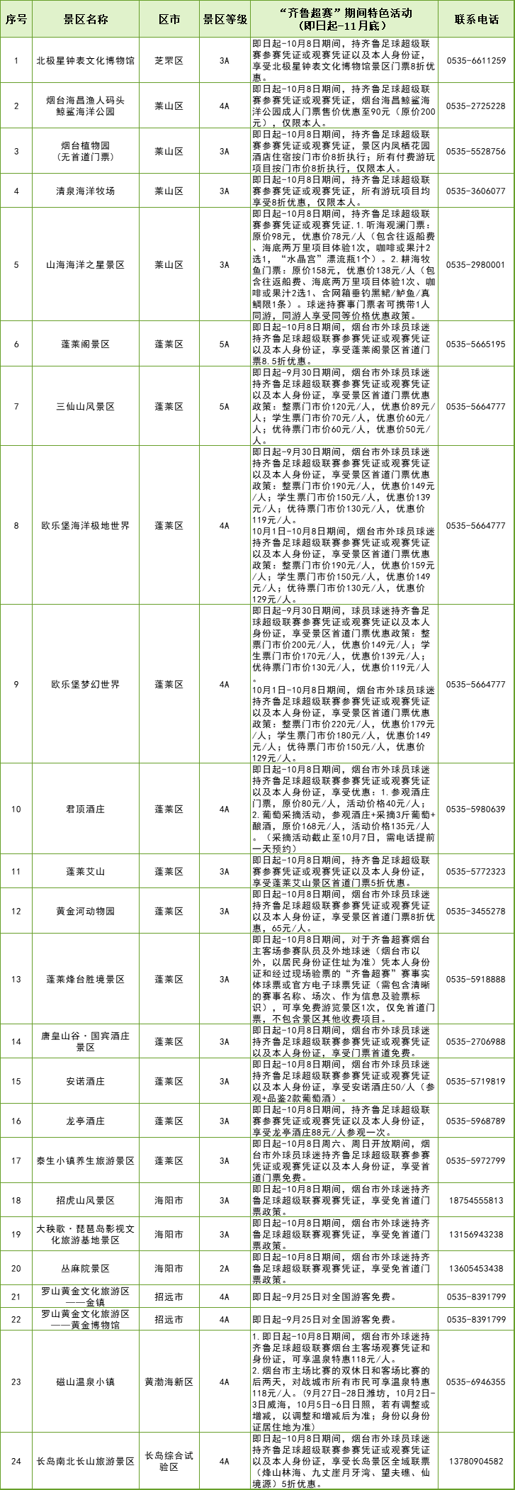 1.2025年9月20日至2025年10月8日期间,外地球迷(烟台市以外,以居民身份证住址为准)凭齐鲁超赛烟台主客场入场票和身份证,可以免费游参加活动的烟台A级景区(每个景区限游一次)。免费项目仅限首道门票,不含景区内索道、缆车、游船、园中园、导游讲解、停车等其他收费项目。