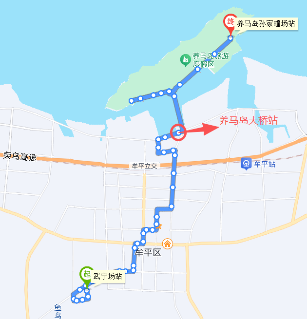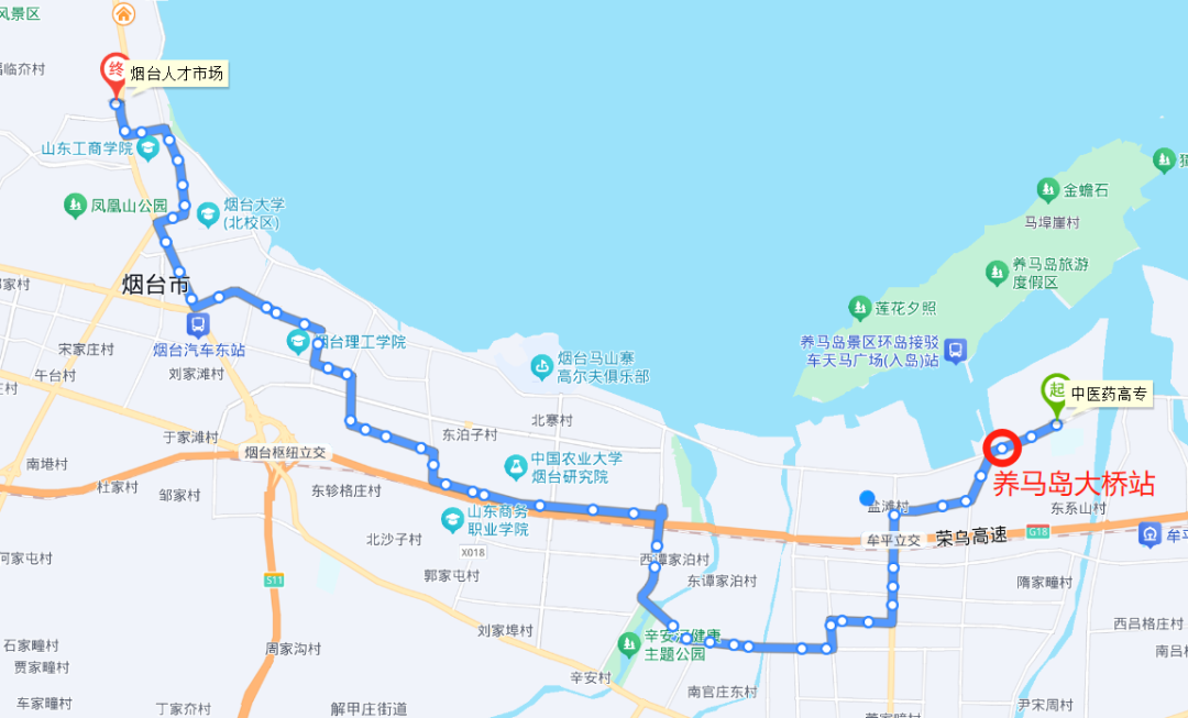 从城区乘坐617路公交车可直接入岛,换乘接驳车游览;乘坐603路、68路公交车可在“养马岛大桥”站下车,步行至“养马岛游客换乘中心”,乘坐接驳车入岛游览。