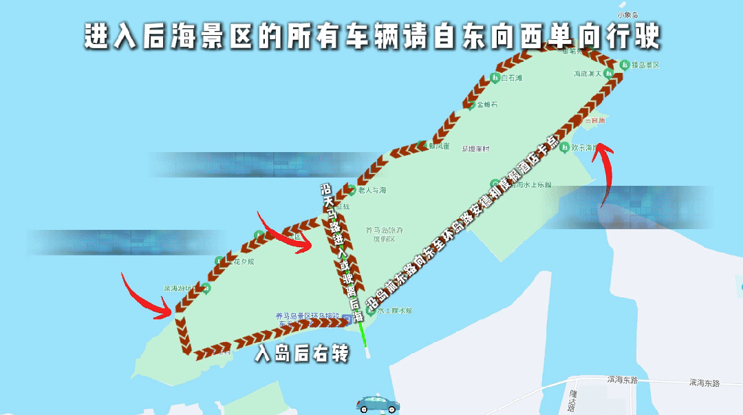 (2)提前预约入岛的市民及游客,若您在养马岛景区内预定宾馆、酒店、民宿、渔家乐等,可将车牌号提供给商家,免费办理入岛电子授权或进入后海景区的电子授权(仅后海景区宾馆、饭店、渔家乐、民宿可办理),通过“养马岛换乘中心停车场”分拣系统直接入岛;若您办理了进入后海景区的电子授权,请按规定路线行驶,并将车辆停在后海景区宾馆、酒店、民宿、渔家乐停车位,不要在路边及路沿石上停放。入岛或进入后海后,可就近乘坐接驳车游览。