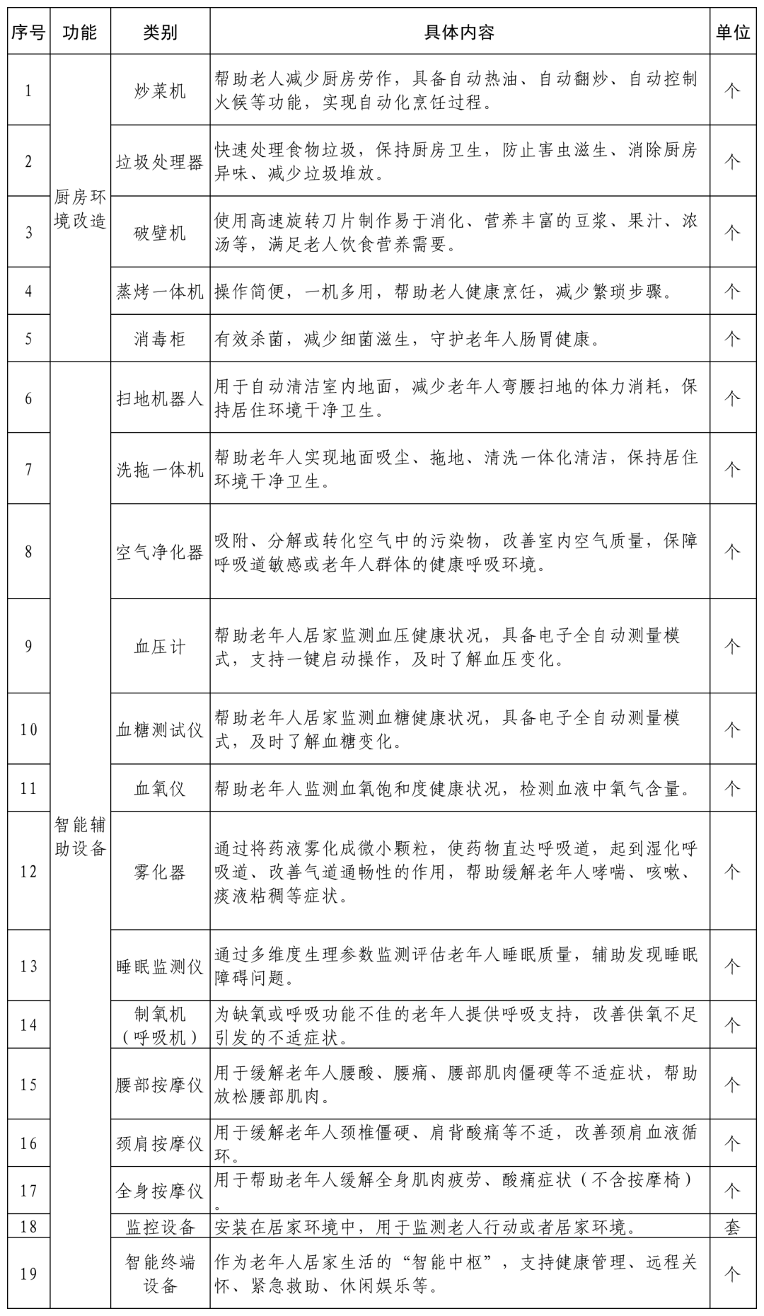 本次新增补贴产品聚焦老年人健康监测、安全防护、生活便利等需求,涵盖厨房环境改造、智能辅助设备两大类别,共计19类产品。
