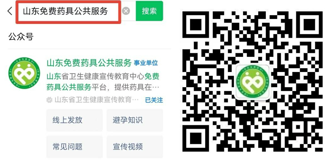 ①在微信中搜索“山东免费药具公共服务”公众号或扫描二维码,并添加关注。
