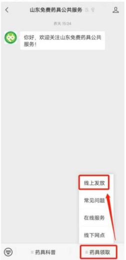 ②进入“山东免费药具公共服务”公众号,点击“药具领取 - 线上发放”。