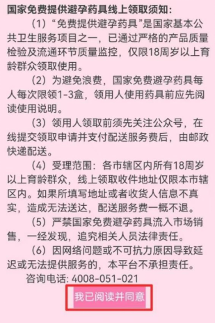 ③页面弹出“国家免费提供避孕药具线上领取须知”,请阅读并点击“我已阅读并同意”。