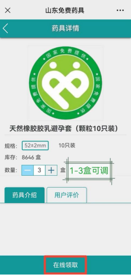 ⑥进入药具详情页面,领取数量1-3盒,可通过“+”“-”选择数量,然后点击下端的“在线领取”。