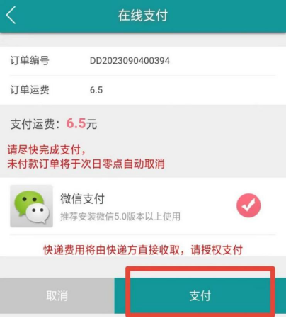 ⑧进入在线支付页面,点击“支付”,确认支付“6.5元”配送服务费,支付成功,完成订单。