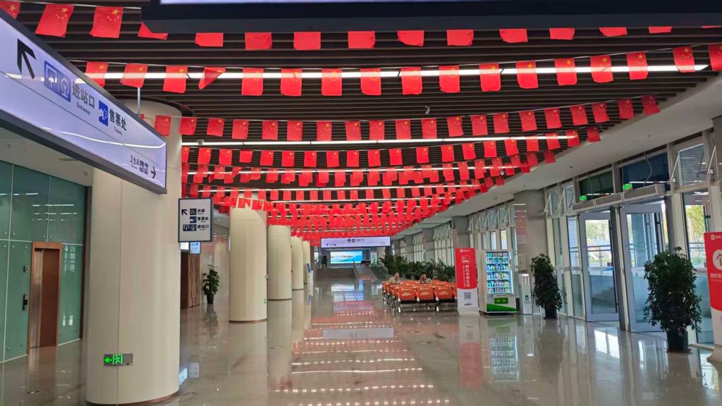 烟台西站相关负责人介绍,为了迎接即将到来的“十一”国庆佳节,烟台西站枢纽场站工作人员早早行动,提前在场站大厅挂满五星红旗,用热烈的节日氛围迎接来来往往的旅客。
