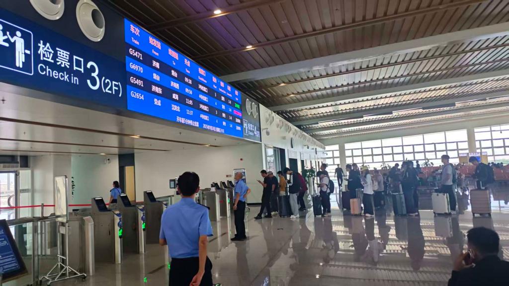 烟台融媒9月26日讯(YMG全媒体记者 何晓波 通讯员 王媛媛 摄影报道)9月26日9点36分,济南—烟台G5471动车稳稳地停靠在烟台西站,从济南到黄渤海新区出差的王先生随着客流穿过烟台西站场站大厅,看到悬挂着的一面面五星红旗,立即感受到了浓浓的国庆节日氛围。