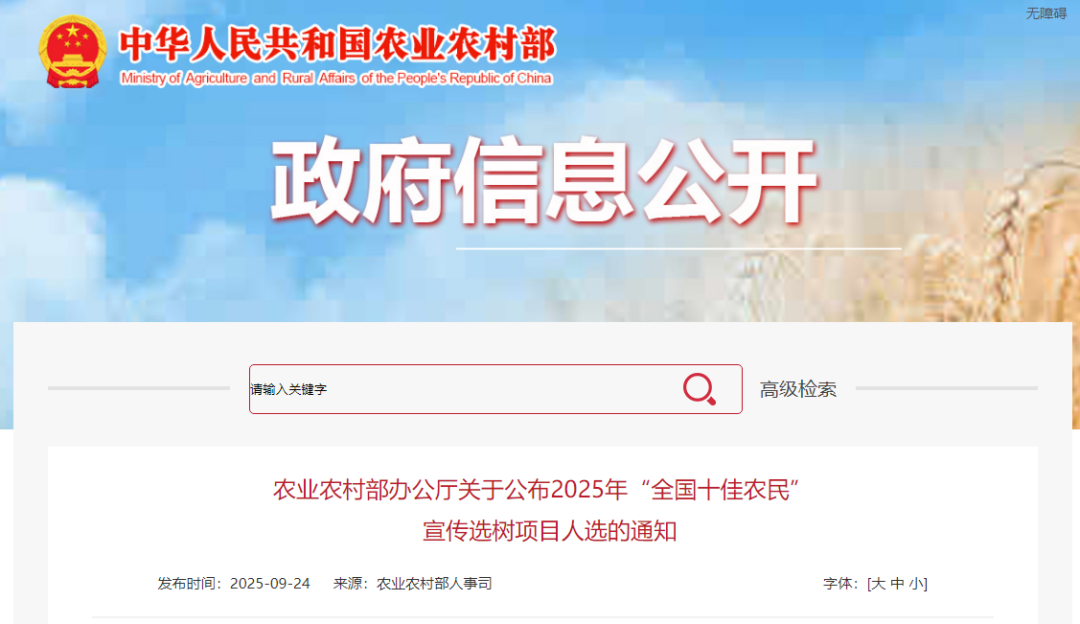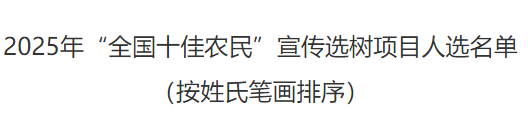 为大力宣传推介扎根农村的优秀农民代表,充分调动广大农民群众积极性,进一步营造重农爱才的良好氛围,经中华农业科教基金会组织推荐、遴选和公示,确定2025年“全国十佳农民”宣传选树项目人选为王春、田淑娴、李忠华、李燕萍、何洪涛、张林兵、陈松海、岳巧云、姚文智、嘎桑加才。