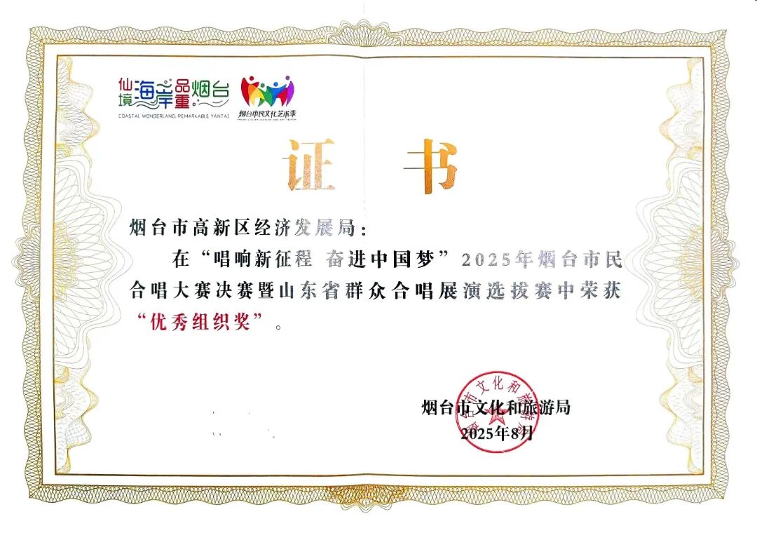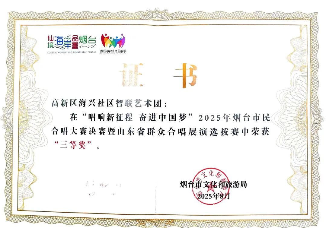 近日,烟台高新区海兴社区智联艺术团在全市2025年市民合唱大赛决赛暨山东省群众合唱展演选拔赛,与全市其他12支优秀合唱团同台竞技,演唱《唱支山歌给党听》《歌唱祖国》两首曲目,荣获三等奖,同时烟台高新区经济发展局荣获“优秀组织奖”,艺术团指导教师获得“优秀指导教师奖”。